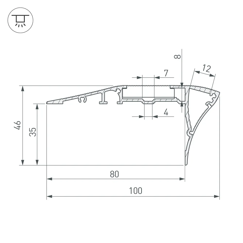 Анодированный профиль для ступеней в помещениях. Подсветка вниз. В комплекте - матовый экран, акриловая ребристая сатинированная вставка (может заменяться на антискользящую резину). Цена за 2м профиля с экраном и вставкой. Размер 100х46 мм