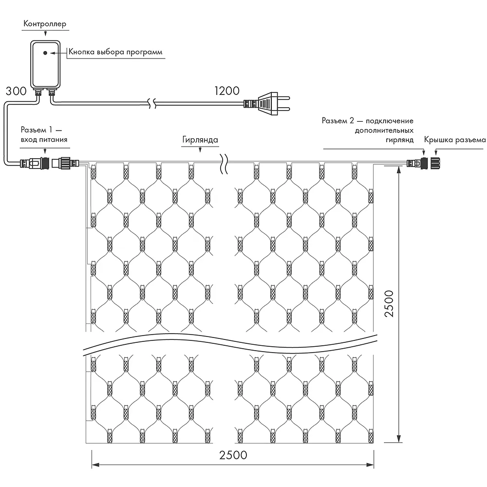 Светодиодная сеть Classic. 2500x2500 (длина 2500 мм, высота 2500 мм). Цвет свечения RGBY (светодиоды чередуются). 432 светодиода размером 7 мм со статическим и 8 динамическими эффектами свечения с резким световым рисунком (прозрачная вогнутая линза). Провод прозрачный, ПВХ. Питание 230 В, Мощность 26 Вт,защита IP65, применение в помещении и на улице под навесом Аксессуары для подключения и выбора режима свечения в комплекте.