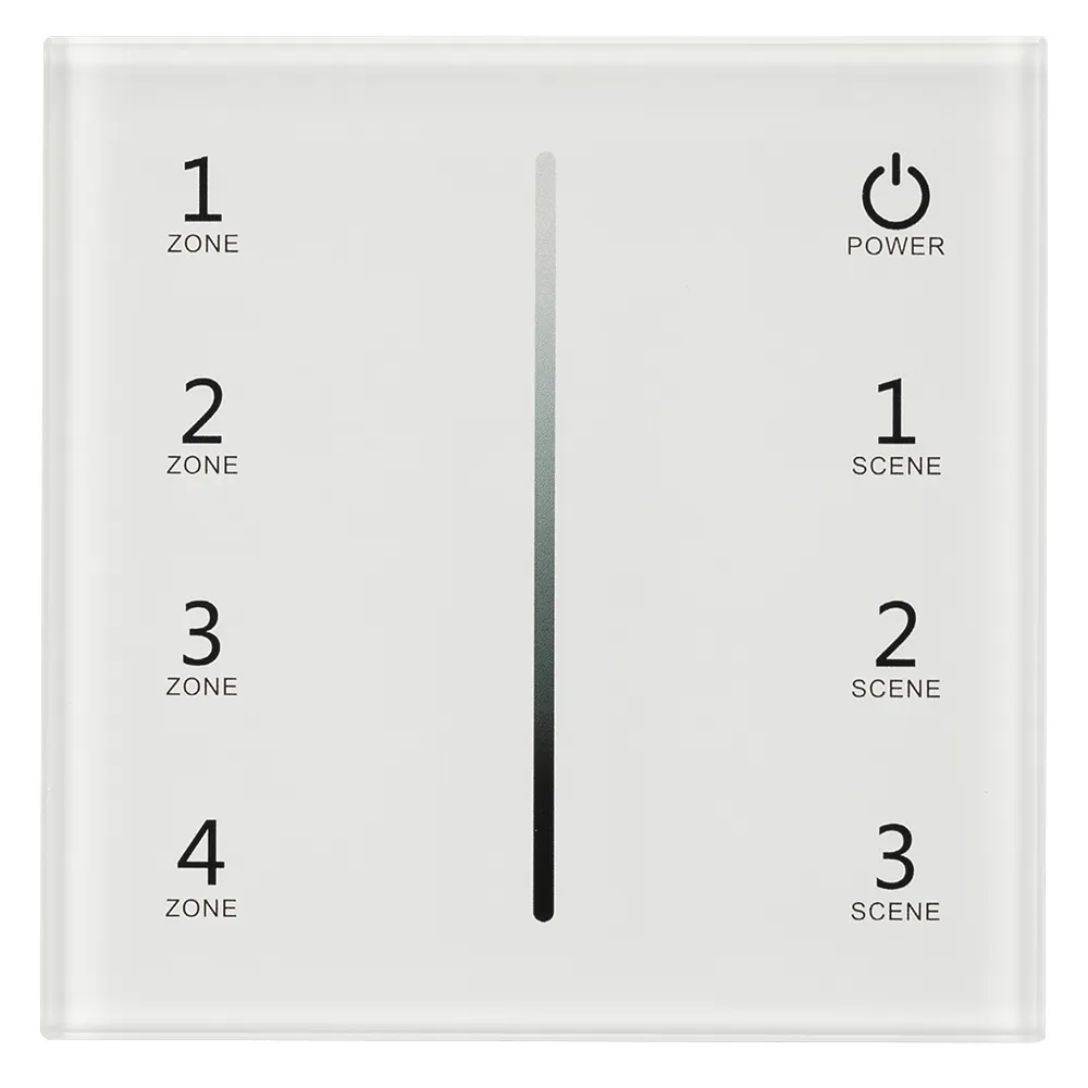 Встраиваемая сенсорная панель, цвет белый. Материал - стекло. Выходной сигнал 0/1-10V. Управление яркостью с сенсорной полосы. 4 зоны управления. Питание 230V, входное напряжение 86-265VAC. Габариты 86х86х35 мм. Панель совместима с 0/1-10V диммерами.