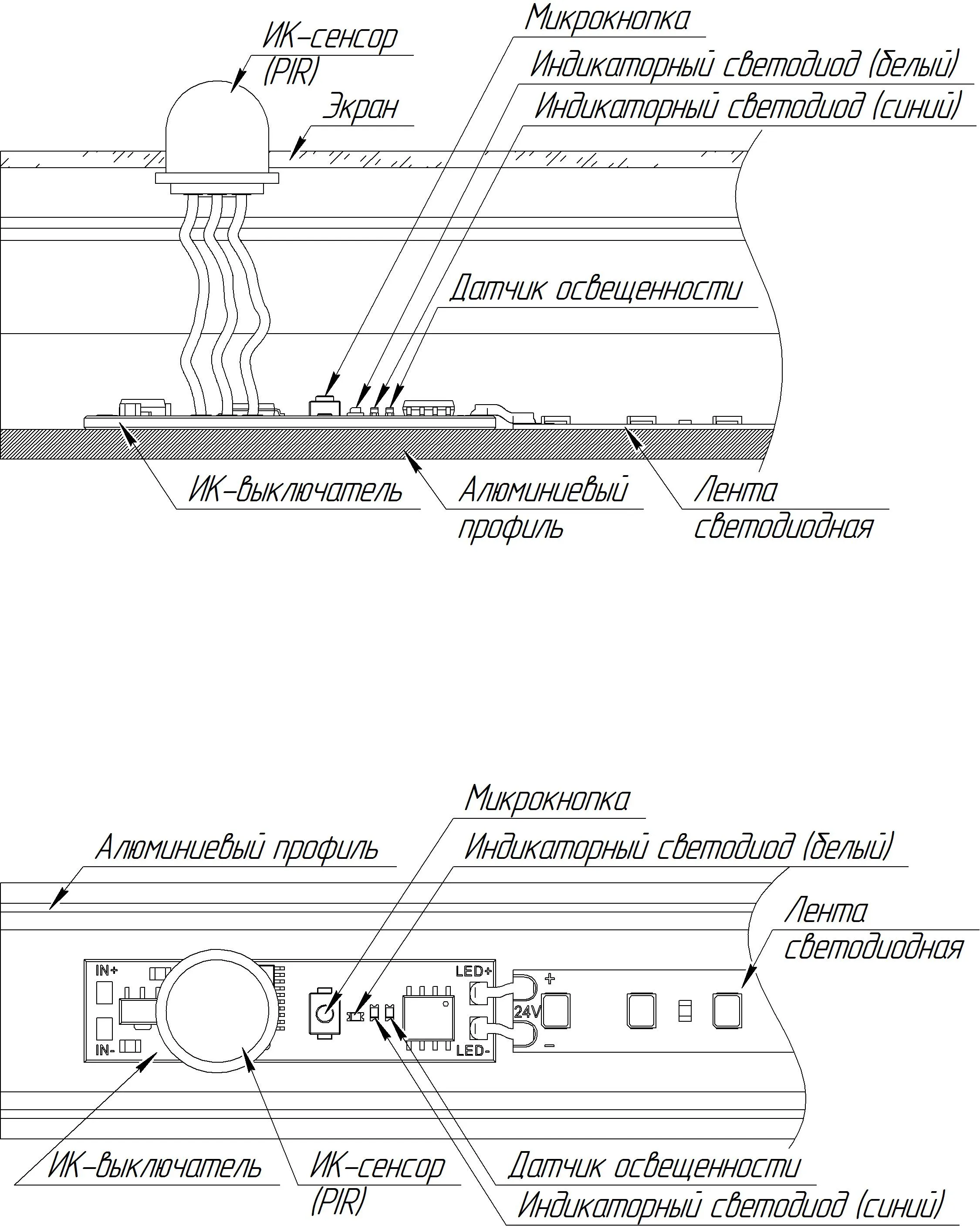 Пассивный ИК-выключатель, встраиваемый в профиль, реагирует на движение. При улавливании движения - плавное включение и выключение света. При пропадании движения - отключение света через ~2мин. Зона срабатывания 1,5-2м. Требуется вырез в экране профиля для работы датчика. Длина кабеля 60мм. Для профилей с внутренней высотой (пов. профиля - пов. экрана) от 5 до 50 мм. 12-24V, 5A. Размер платы 40x11x12 мм, размер датчика: D12х10 мм.