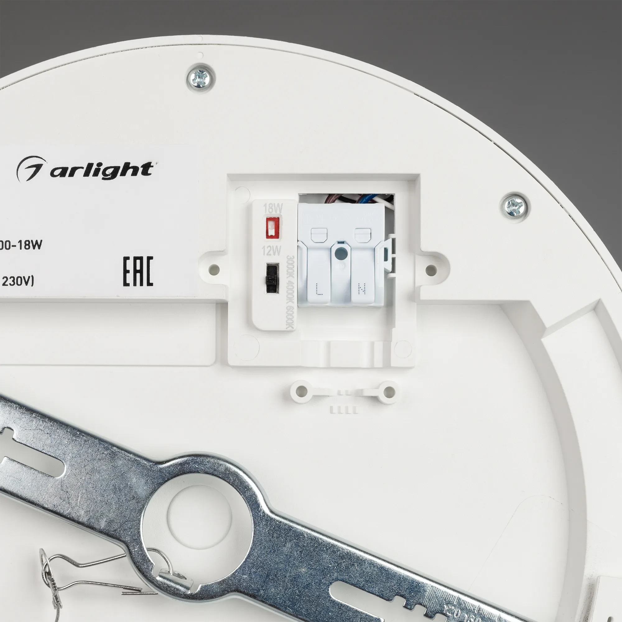 Накладной/встраиваемый светильник с изменяемой мощностью и цветовой температурой. Мощность 8-12 Вт, св. поток 600-900 лм, 75-90 лм/Вт, теплый 3000 K, дневной 4000K, белый 6000K, CRI>80, угол 120°, напряжение питания 230 В. Белый круглый корпус из пластика, экран поликарбонат, степень защиты IP44. Размер: диаметр 180 мм, высота 20,5 мм. Монтаж накладной/встраиваемый, установочное отверстие: диаметр 80-160 мм (регулируемое). Драйвер встроенный, пульсация <1%. Комплект крепежа для встраиваемого монтажа поставляется отдельно.