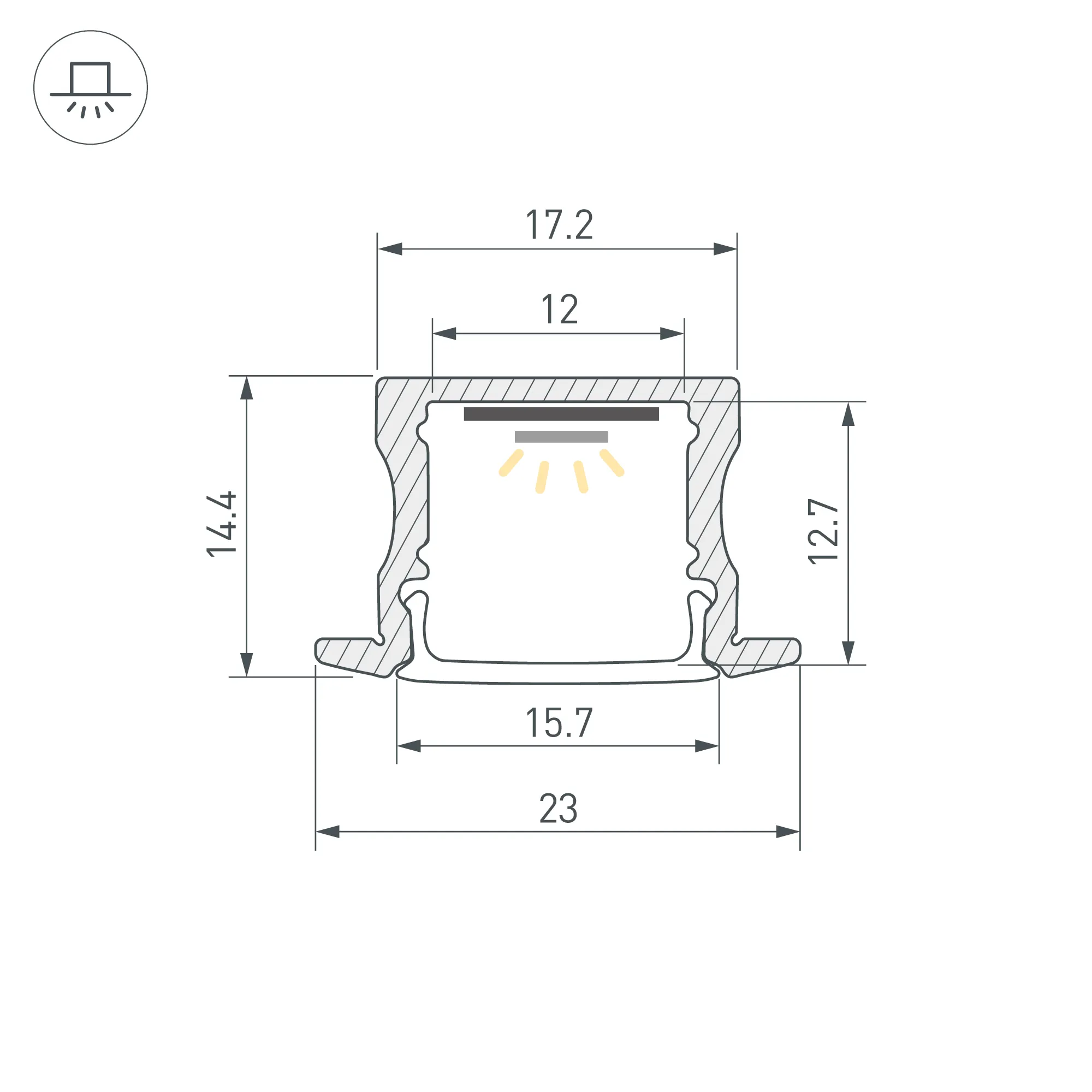 Алюминиевый анодированный встраиваемый профиль для светодиодных лент и линеек. Габаритные размеры (L×W×H): 2000x23x14,5 мм. Паз для установки 18мм. Ширина площадки для ленты 12,4 мм. Экраны, заглушки и другие аксессуары приобретаются отдельно. Цена за 1 метр.