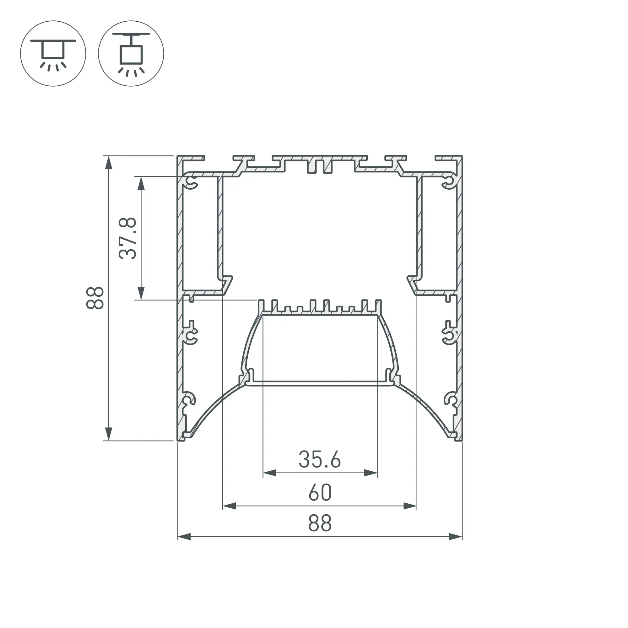 Алюминиевый анодированный профиль для светодиодных лент и линеек. Габаритные размеры (L×W×H): 2000x88x88 мм. Состоит из профиля и основания для ленты. Для их соединения необходим Фиксатор основания арт. 036431 (приобретается отдельно, 4 шт. на 2 м. профиля). Ширина площадки для ленты 35,6 мм. Отсек для БП 48х38 мм. Экраны, заглушки и другие аксессуары приобретаются отдельно. Цена за 1 метр.