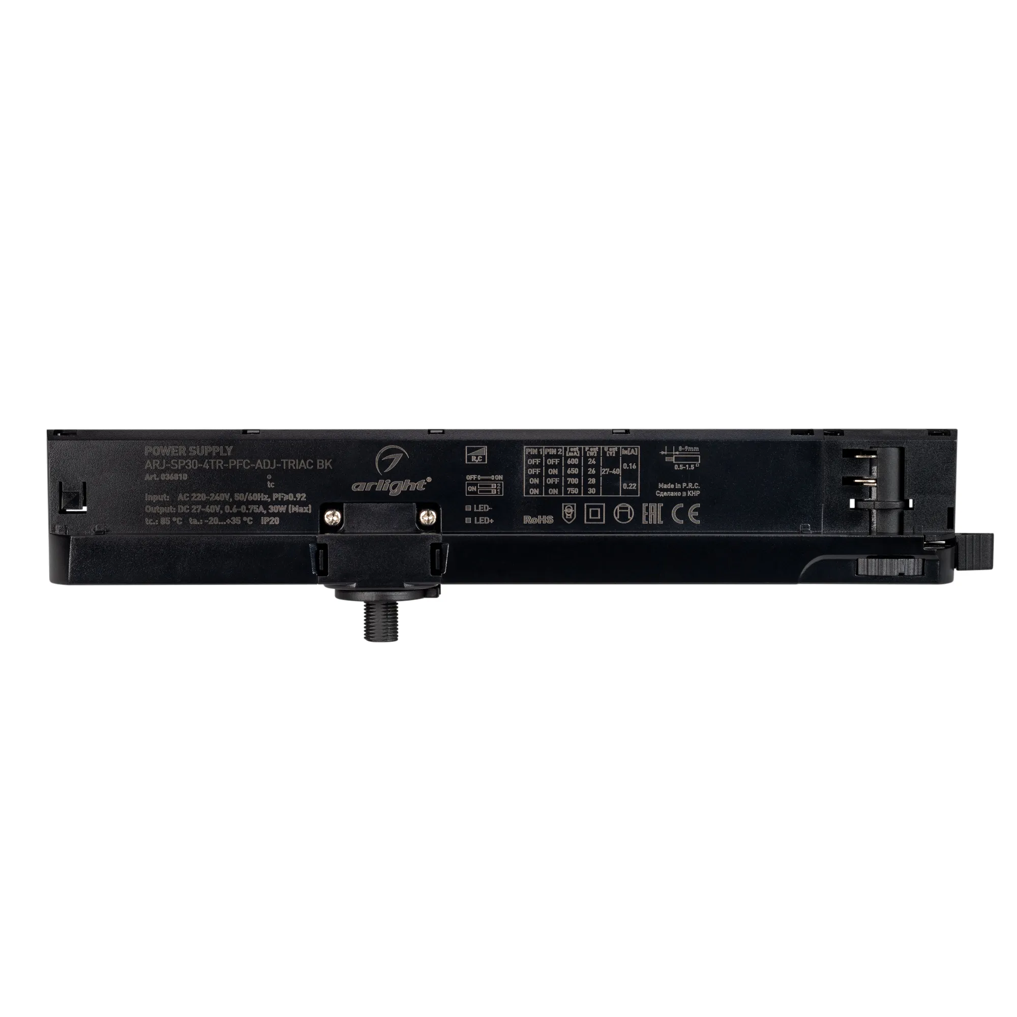 Диммируемый источник тока по стандарту TRIAC, с гальванической развязкой, предназначен для работы с трёхфазной трековой системой 4TR. Выходной ток 600/650/700/750mA (дип-переключатель), вых. напр. 27-40V, макс. 30 Вт. Пластиковый корпус IP20, размеры 250x31x45 мм. Питание 220-240VAC, корректор мощности PFC>0,92. Диапазон раб.темп. -20..+35С. Гарантия 5 лет.