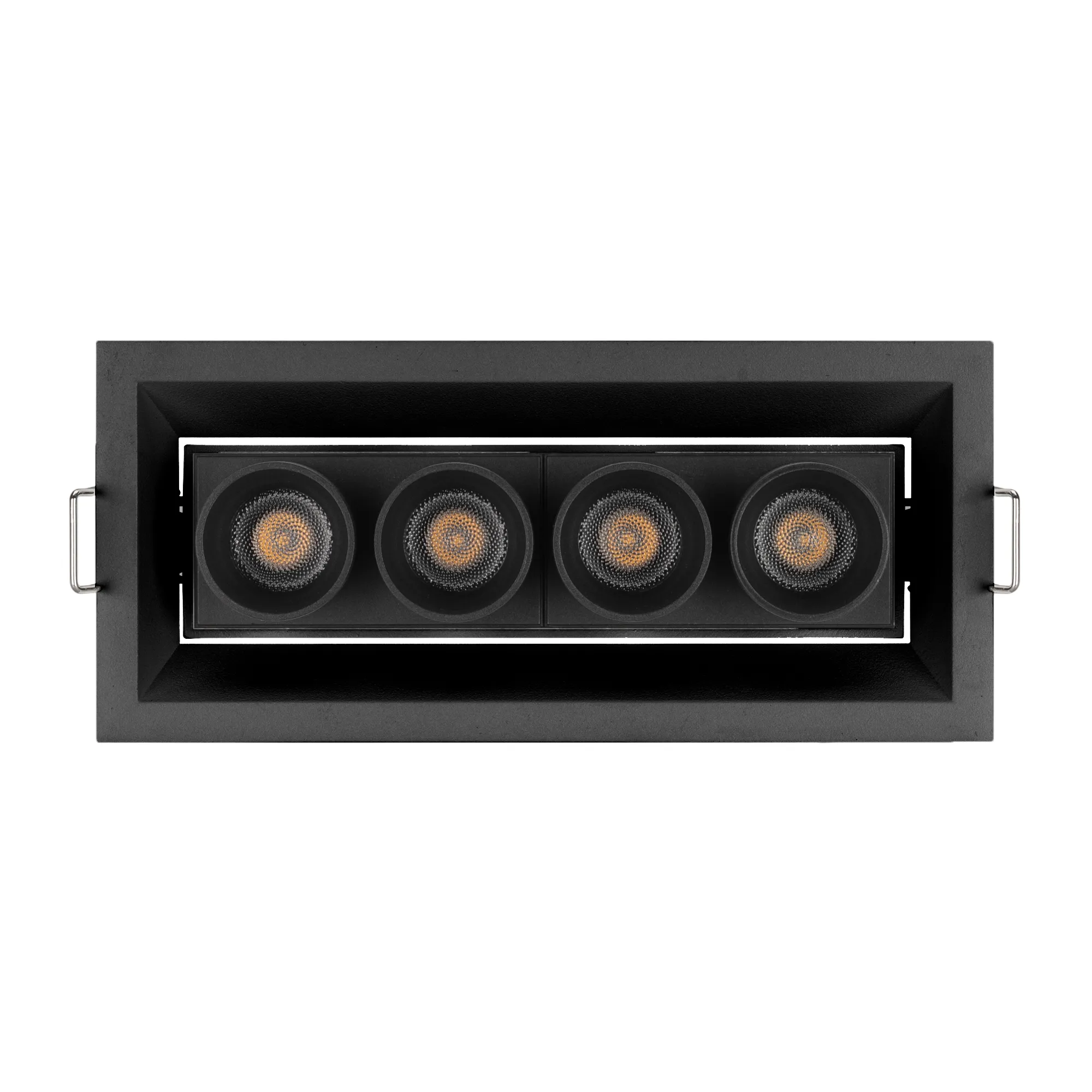 Встраиваемый поворотный светильник. Мощность 10 Вт, св. поток 750 лм, 75 лм/Вт, теплый 3000 K, CRI>98, угол 30°, напряжение питания 230 В. Чёрный прямоугольный корпус из алюминия, экран PMMA, степень защиты IP20. Размер: длина 150 мм, ширина 67 мм, высота 50 мм. Монтаж встраиваемый, установочное отверстие длина 145 мм, ширина 60 мм. Драйвер 9-14 В, 700 мА, пульсация <1%.