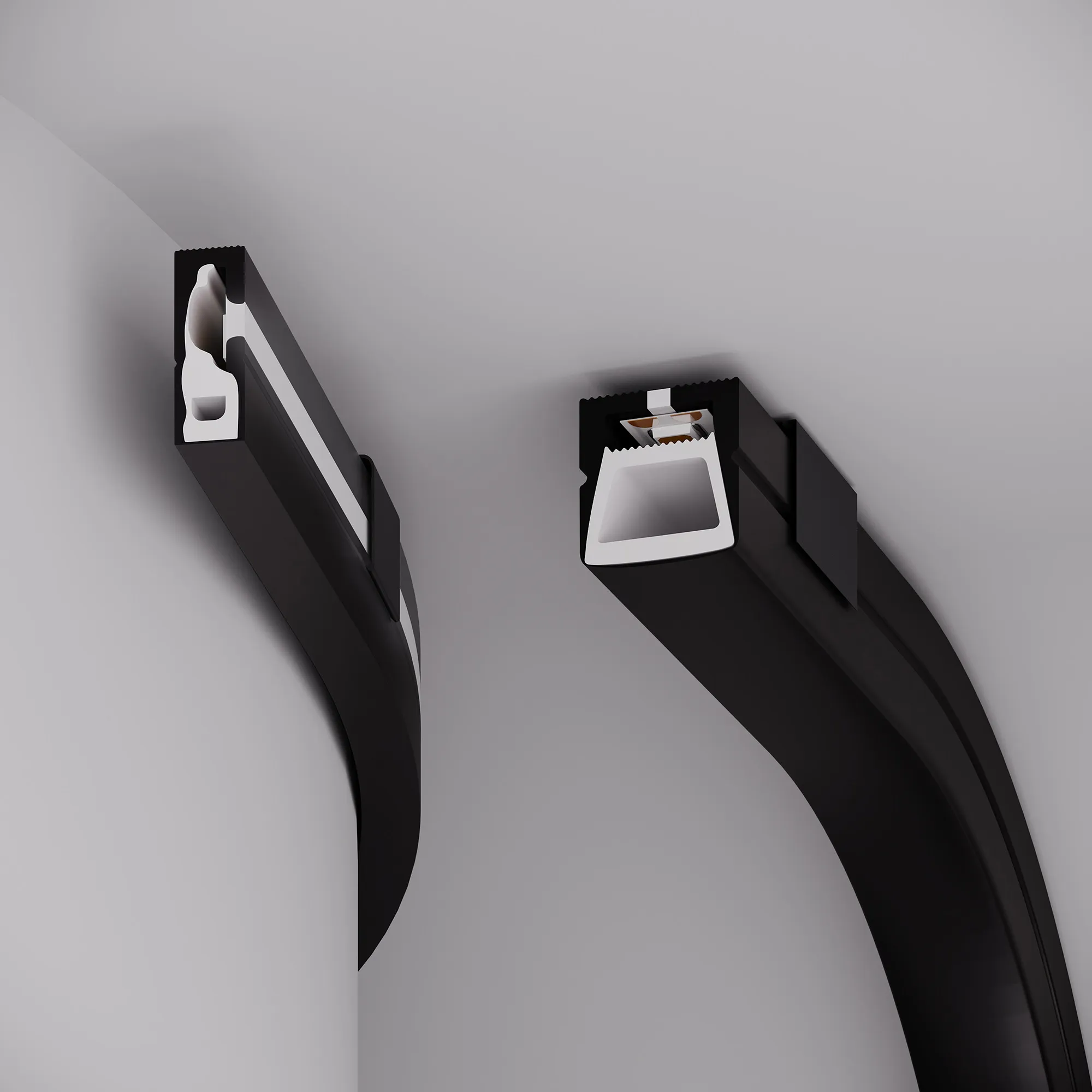 Цельнолитой силиконовый гибкий профиль, черный матовый. Габаритные размеры 5000×16×16 мм. Вертикальный изгиб TOP, минимальный радиус изгиба 60 мм. Для установки во влажных помещениях необходима герметизация при помощи двухкомпонентного эпоксидного герметика. Класс пылевлагозащиты – IP65 (при соблюдении технологии герметизации). Для лент шириной 10 мм, высотой до 2,85 мм и мощностью до 10 Вт/м. При подборе ленты необходимо учитывать, что втяжка лент COB, герметичных лент и лент с наличием силиконового слоя может быть затруднена. Угол излучения 110°. Поставляется в катушках по 5 м. Цена за 1 м.