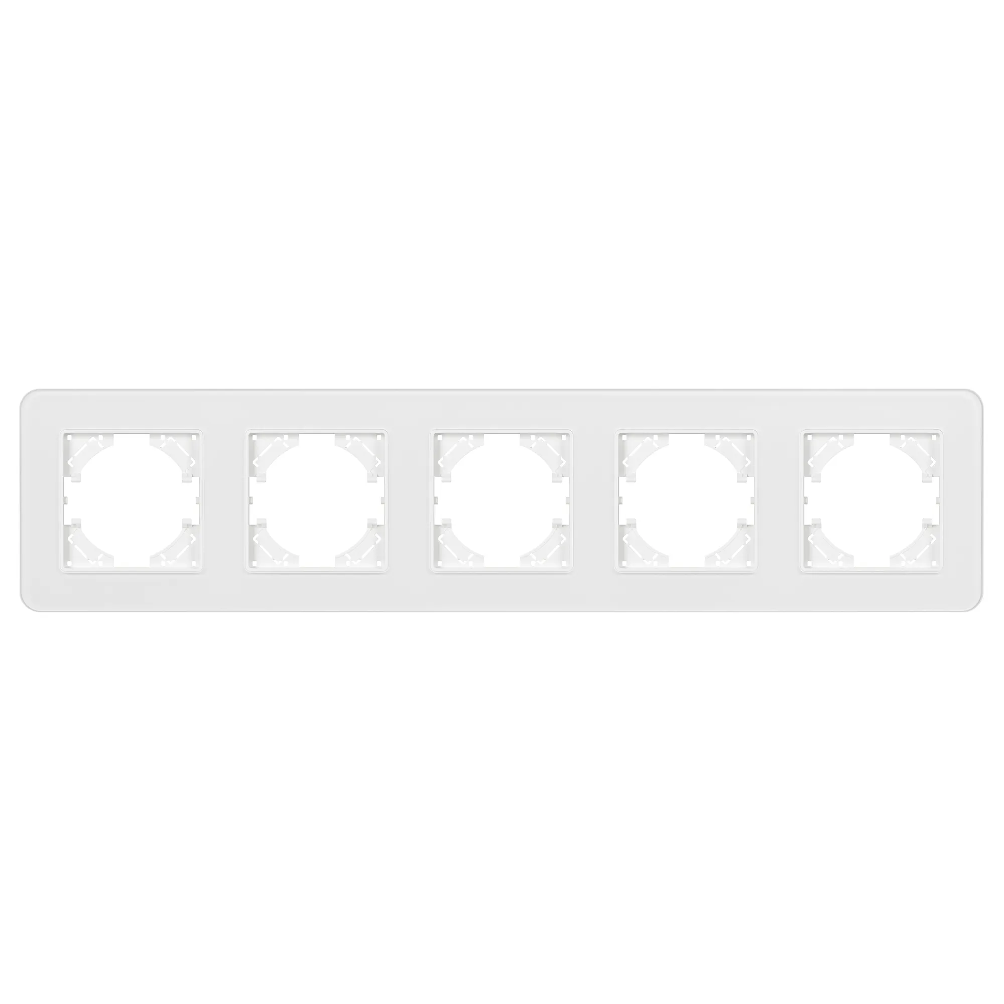 Рамка стеклянная на 5 постов, под встраиваемый механизм. Цвет - белый с Soft-Touch покрытием. Уровень герметичности IP20. Ориентация монтажа - горизонтальная (основным ориентиром служат посадочные выступы для накладки механизма).