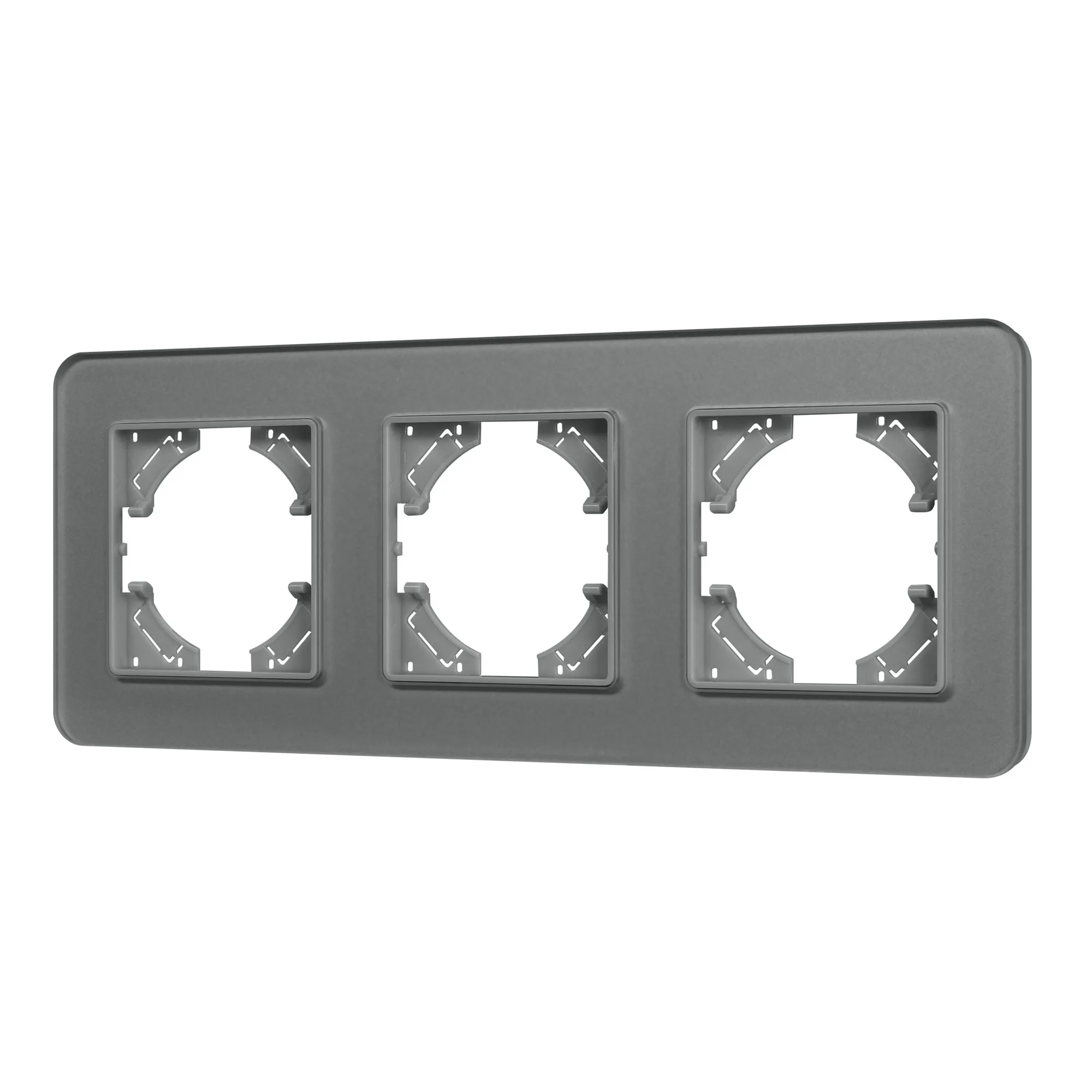 Рамка стеклянная на 3 поста, под встраиваемый механизм. Цвет - серый с Soft-Touch покрытием. Уровень герметичности IP20. Ориентация монтажа - горизонтальная (основным ориентиром служат посадочные выступы для накладки механизма).