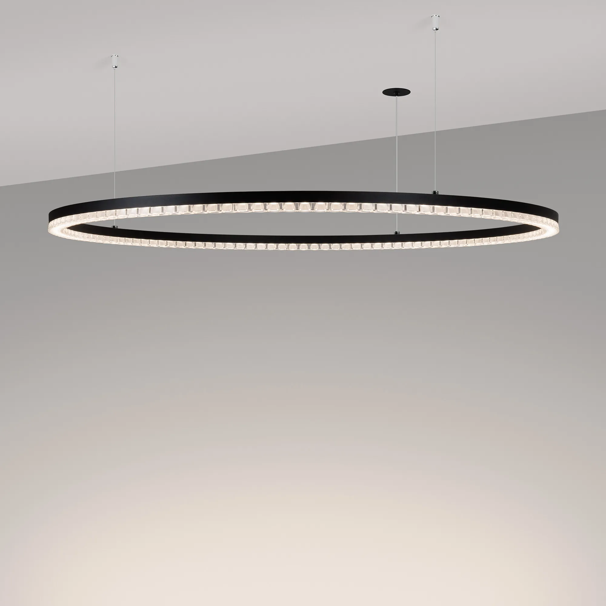 Подвесной светильник. Мощность 60 Вт, св. поток 5250 лм, 80-95 лм/Вт, дневной белый 4000 K, CRI>90, угол 45°, напряжение питания 230 В. Черный круглый корпус из алюминия, экран PMMA, степень защиты IP20. Размер: диаметр 1050 мм, высота 34 мм, ширина профиля 30 мм, размер чаши: диаметр 65 мм, высота 26 мм. Монтаж подвесной, длина подвеса 1200 мм, тип чаши встраиваемый, диаметр установочного отверстия чаши 60 мм. Драйвер (2 шт) 9-42 В, 700 мА. Пульсация < 0,3%.